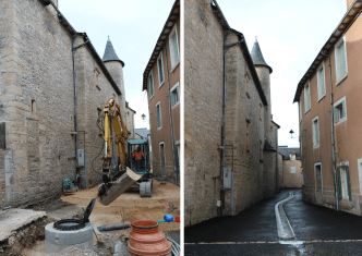 Assainissement de la rue basse terminés. Le réseau séparatif est fonctionnel, un revêtement tricouche finalise les travaux.